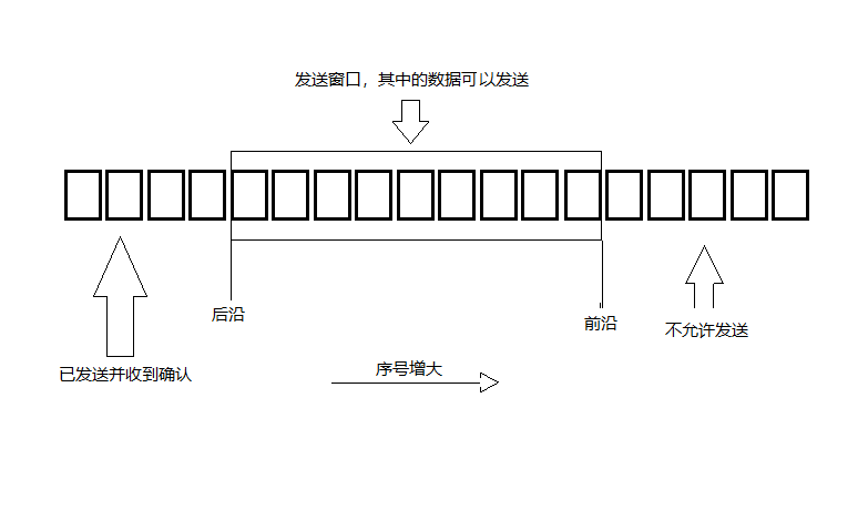 发送窗口的位置由前沿和后沿的位置共同决定。后沿后面的部分表示已经发送并且收到了确认,前沿之前表示不允许发送的数据,前沿和后沿之间就是窗口大小。